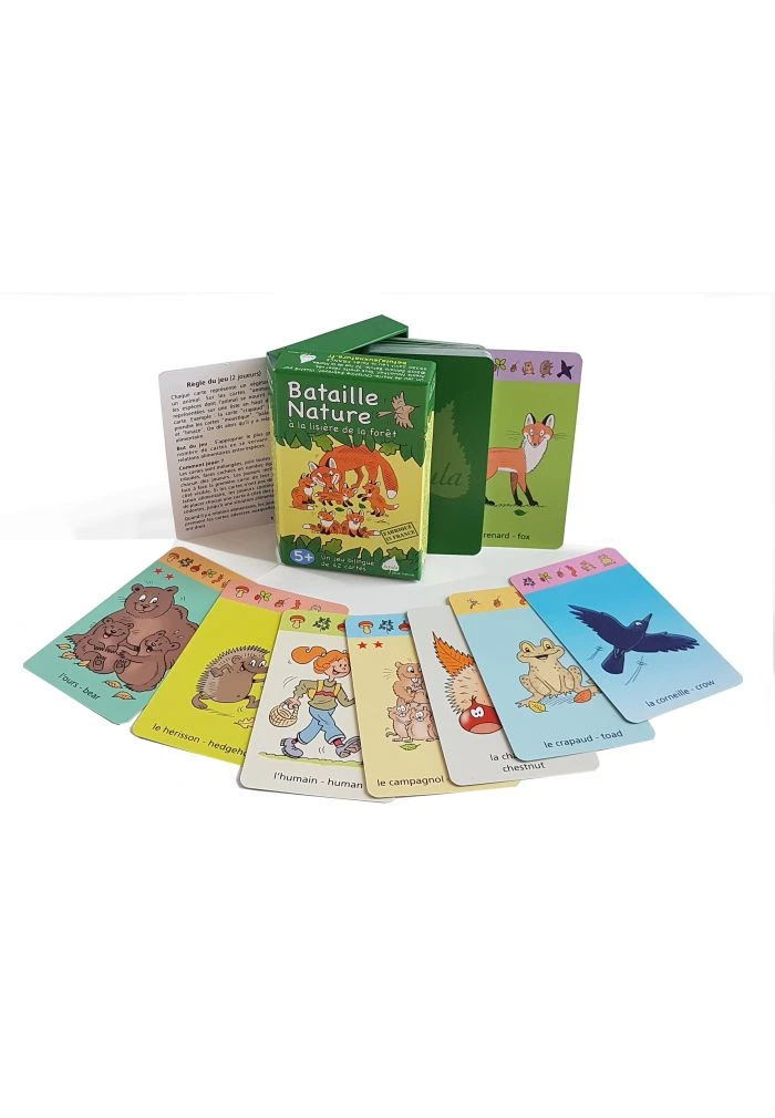 Dans un coffret carton, le jeu contient 42 cartes illustrées bilingues.