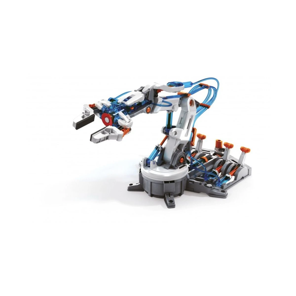 Le bras robot est à assembler et est contrôlable grâce à une pompe hydraulique et ses 6 manettes de contrôle. Vous pourrez ainsi soulever des objets légers et réaliser différentes actions avec sa pince ou sa ventouse.