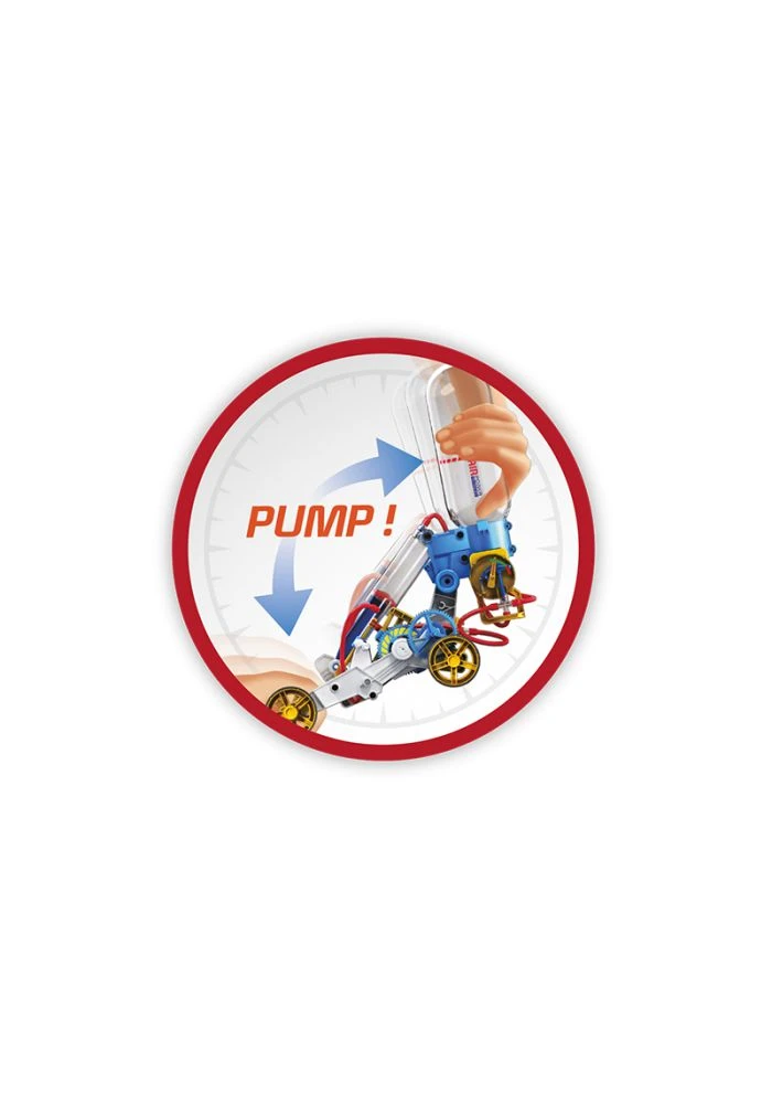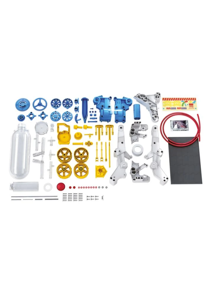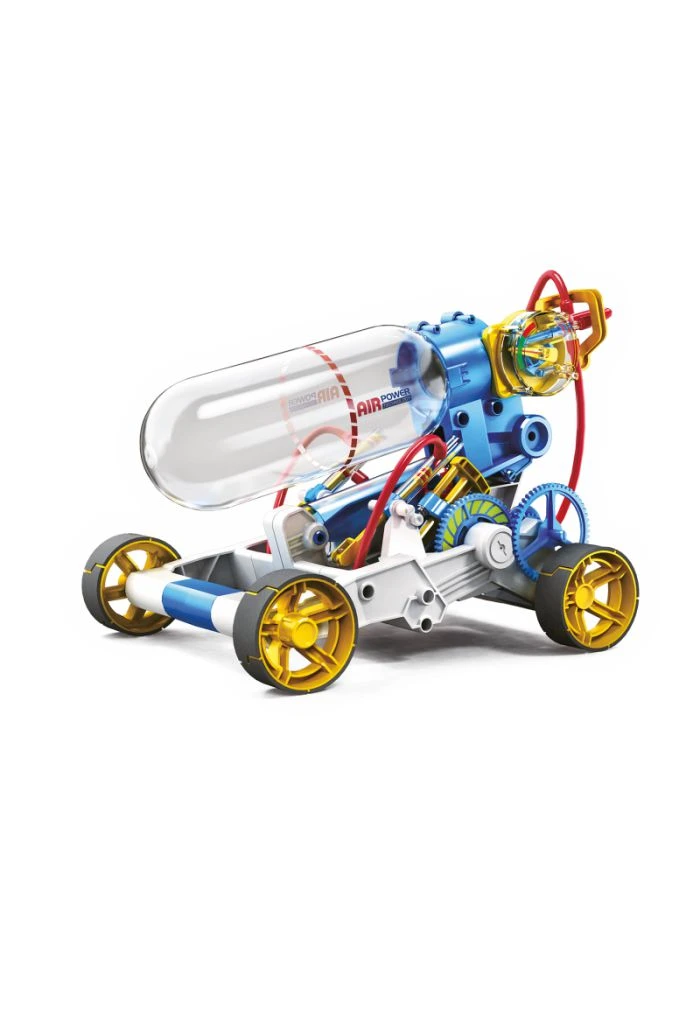Assemble les pièces et tu verras un véhicule qui avance grâce à l’air comprimé.