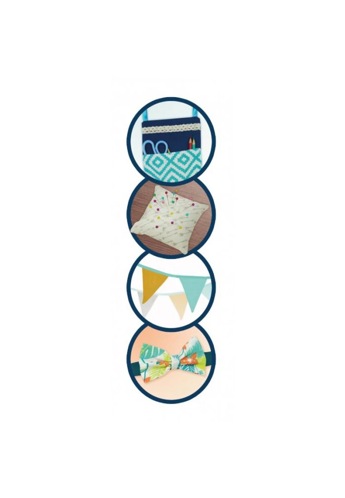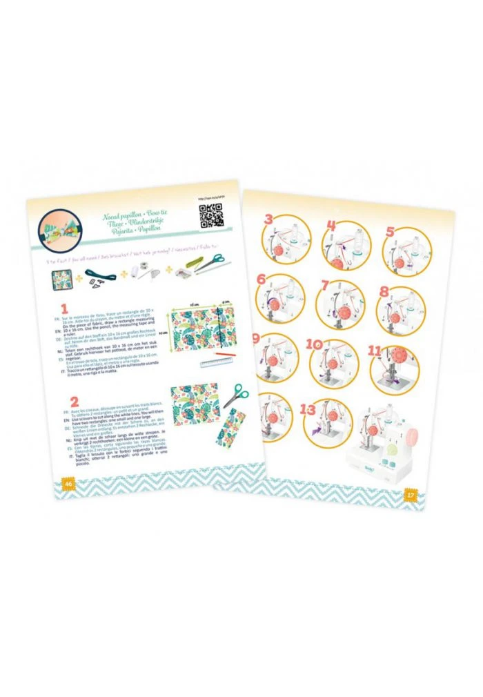 Elle ter permet de réaliser tes premiers noeuds papillons, coussins, guirlandes de fanions et vide-poches muraux, et des notices sont là pour t’expliquer pas à pas comment coudre correctement.