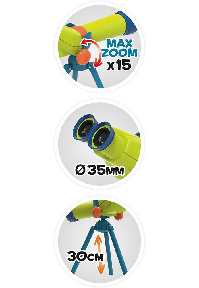 Contient des accessoires adaptés aux plus petits : un télescope binoculaire grossissement X15, diamètre 35mm et un trépied de 30 cm.
