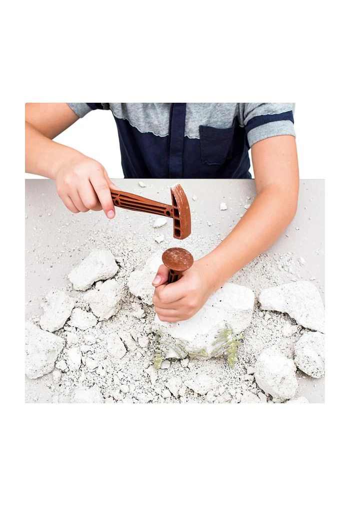 Le coffret scientifique contient un bloc de terre composé de plâtre de sable et d’argile, un marteau, un burin, un grattoir ainsi qu’un manuel d’instruction pour devenir le plus efficace des chasseurs de fossiles !