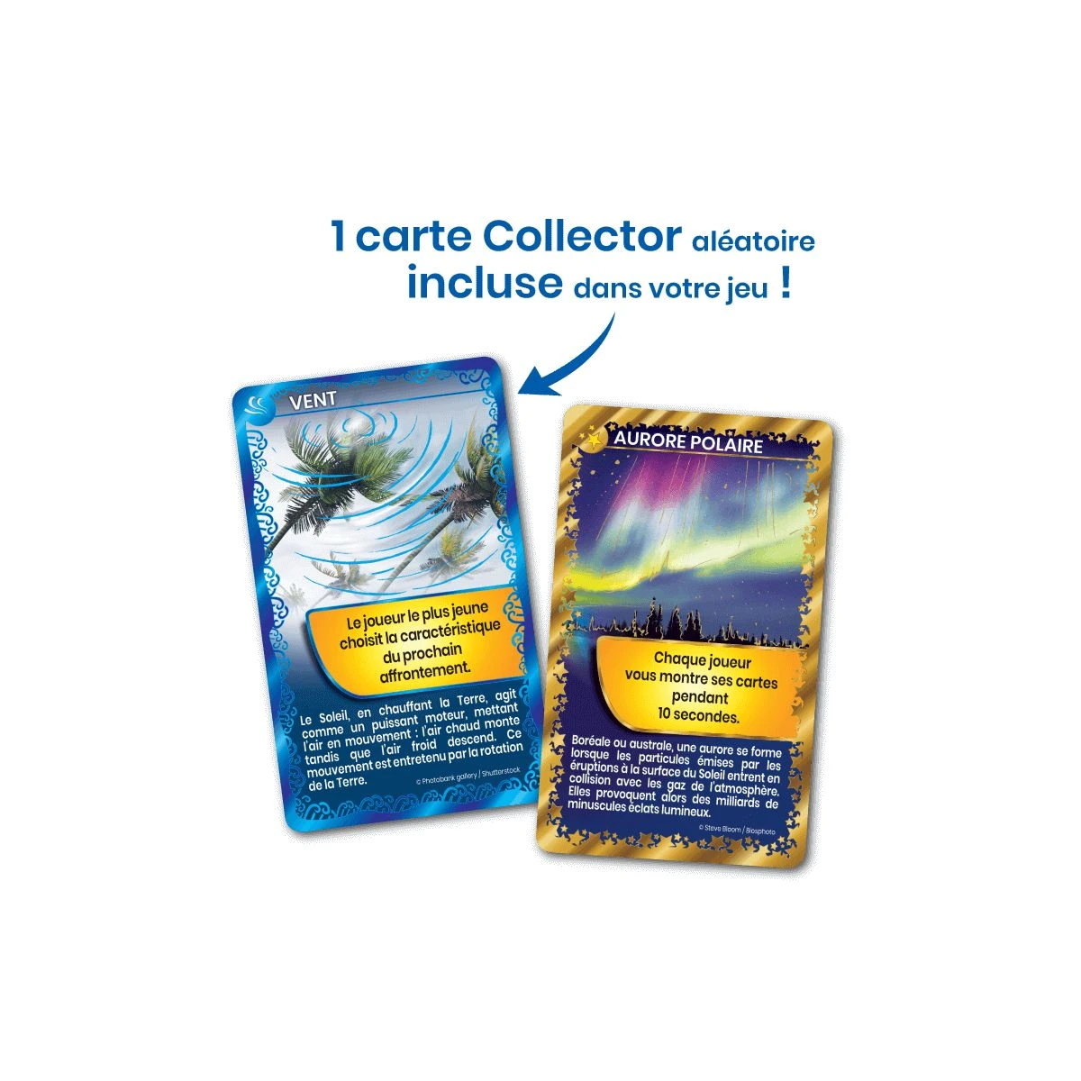 Le jeu de cartes Défis Nature – Animaux d’eau douce comprend une carte collector aléatoire qui permet aux joueurs de découvrir un phénomène naturel comme une aurore polaire, un arc-en-ciel ou une tornade. Cette carte entraîne une action spécifique sur la manche et ajoute plus de diversité et d’amusement au jeu. Il y a 18 cartes collector disponibles et il est possible de se procurer les cartes collector Défis Nature sur notre site internet.
