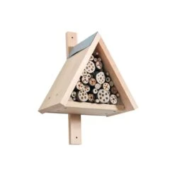 Ici, les insectes utiles trouveront un gîte accueillant pour déposer leurs œufs. Le gros œuvre de l’hôtel est terminé en un clin d’œil, car seules les pièces en bois doivent être vissées entre elles. Une tôle protège le pignon de l’humidité. 8 branches pré-percées sont fournies pour « meubler » l’intérieur, et les enfants pourront chercher eux-mêmes dans la nature les autres matériaux de remplissage.
