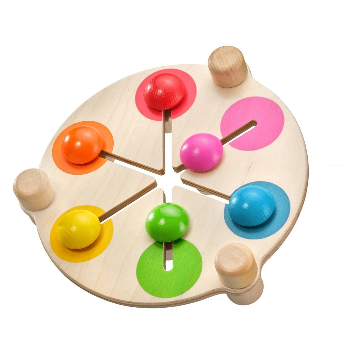 Avec cette planche de jeu colorée, amusez-vous à pousser le bouton de couleur à la bonne couleur associée.