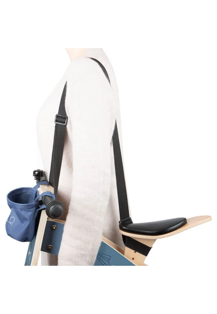Puis, une sangle de transport permet de porter à l’épaule la draisienne si l’enfant fatigue et ne veux plus rester dessus.