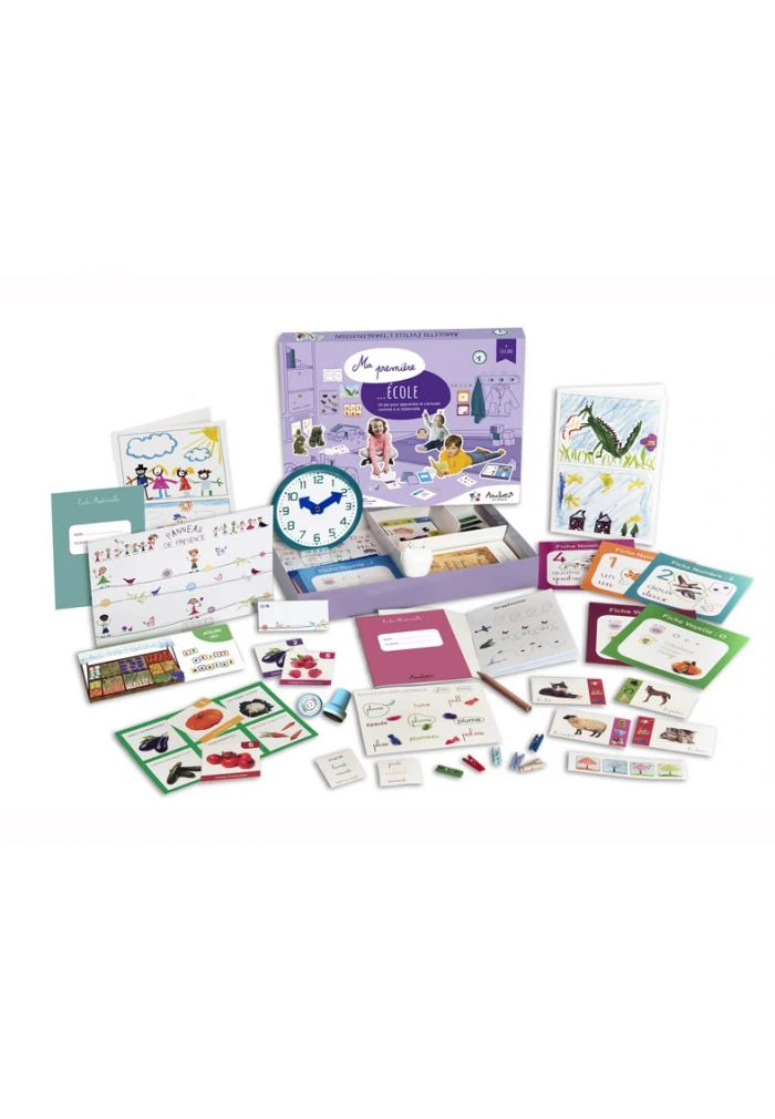 Contenu : + de 60 accessoires : panneaux, cahiers, fiches, jeux de cartes, post-it, dessins et coloriage, stickers, ainsi qu’une cloche, une horloge factice, un tampon encreur, un mini-cabas, un fil, 6 mini pinces à linge et un crayon de bois.