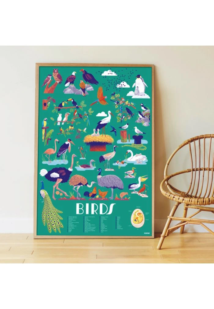 Ce poster pédagogique permet aux enfants de se familiariser avec les oiseaux du monde (la cigogne, le martin-pêcheur ou encore le perroquet).