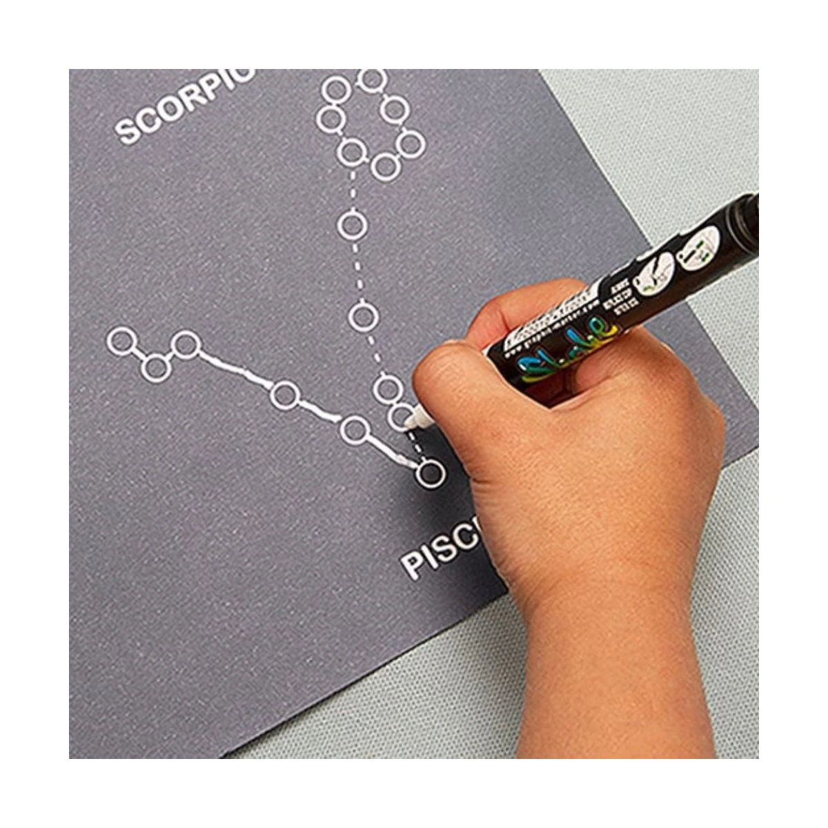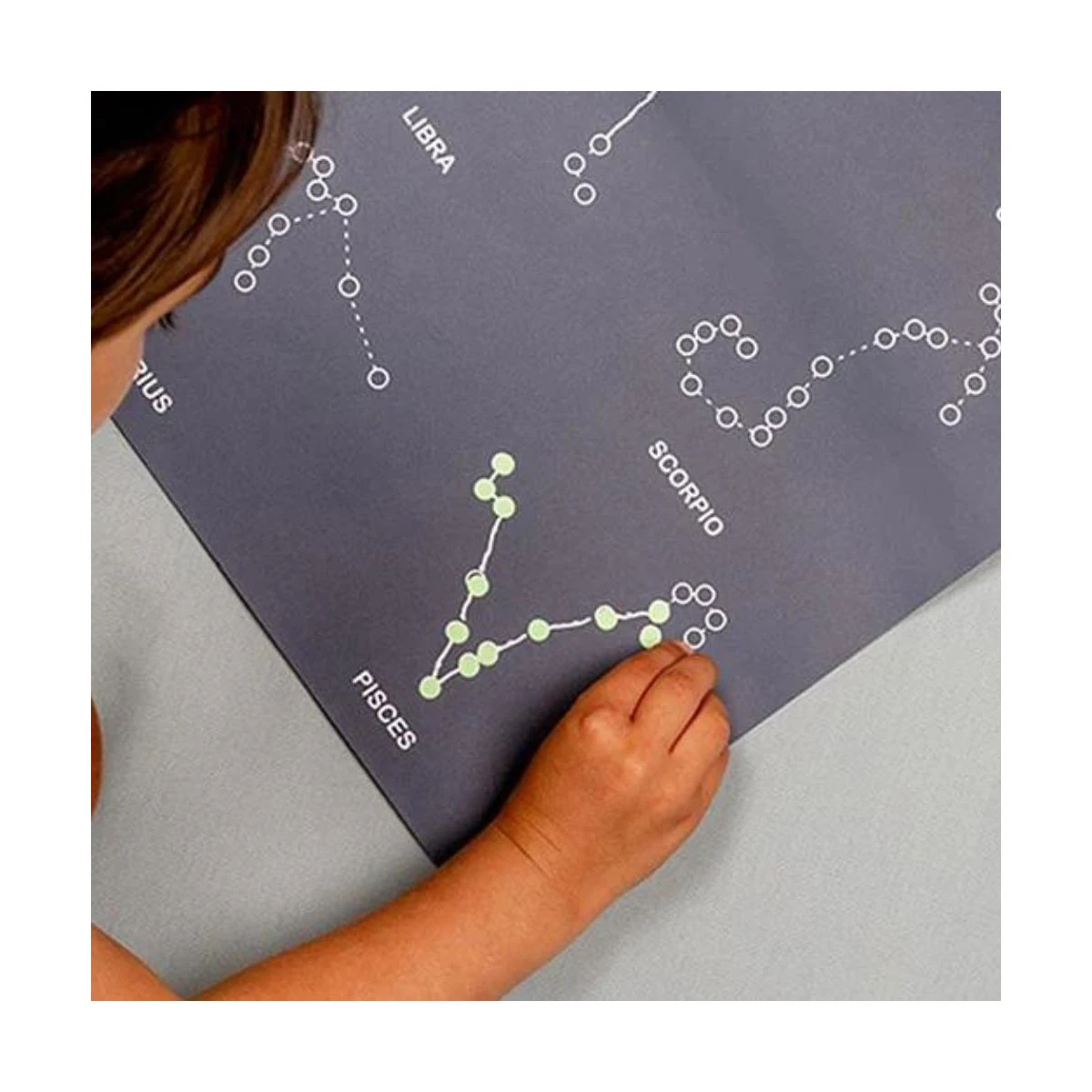 Utilise le marqueur blanc opaque fourni dans le kit pour relier les points et ainsi créer le poster des constellations en plein jour. Mais c’est la nuit que la magie opère ! Colle les 154 gommettes phosphorescentes pour reconstituer la voûte étoilée dans ta chambre. Laisse-toi émerveiller par ce ciel étoilé brillant dans l’obscurité.